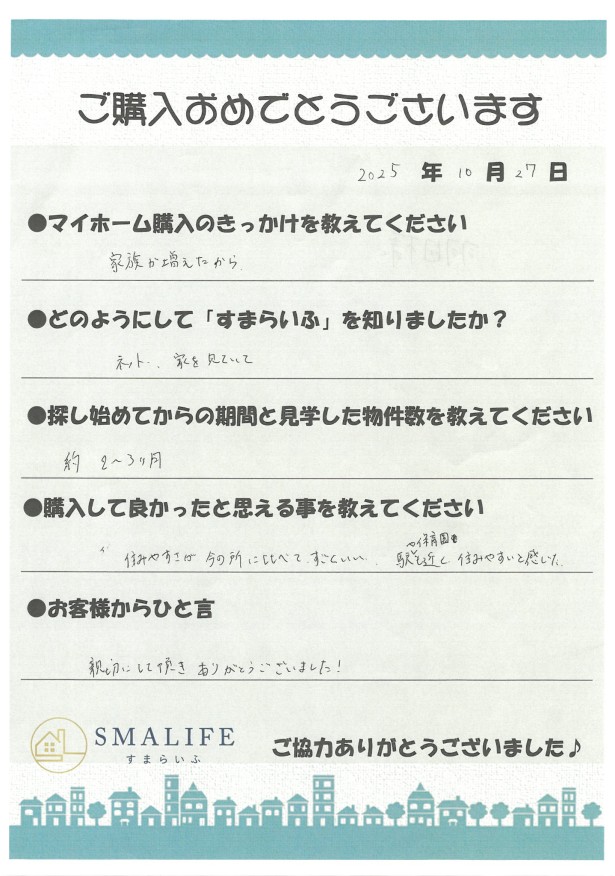 H様 東大和市新築戸建を成約されたお客様の声 | 所沢市の新築一戸建て購入ならすまらいふ
