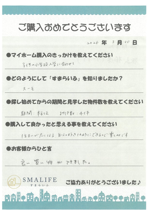 この度はご購入頂きまして誠にありがとうございました。 S様は弊社が現地販売をしている狭山市内の物件に、ご来場を頂きまして、ご成約となりました!ご主人様のご実家周辺で探されており、タイミング良く価格等を含めて良い物件がご購入できたと思います。ご家族様で仲良く、楽しい新築ライフをお過ごしください!今後ともよろしくお願いいたします。
